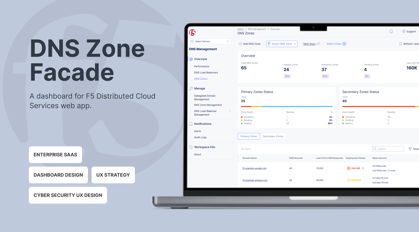 Faced with slow, unclear DNS zone management in F5 XC, I led UX strategy as sole designer, translating complex NetOps needs into a risk-aware dashboard. By unifying zone overviews, separating Primary/Secondary details, and visualizing record types, I reduced cognitive load and enabled faster, confident operational decisions.